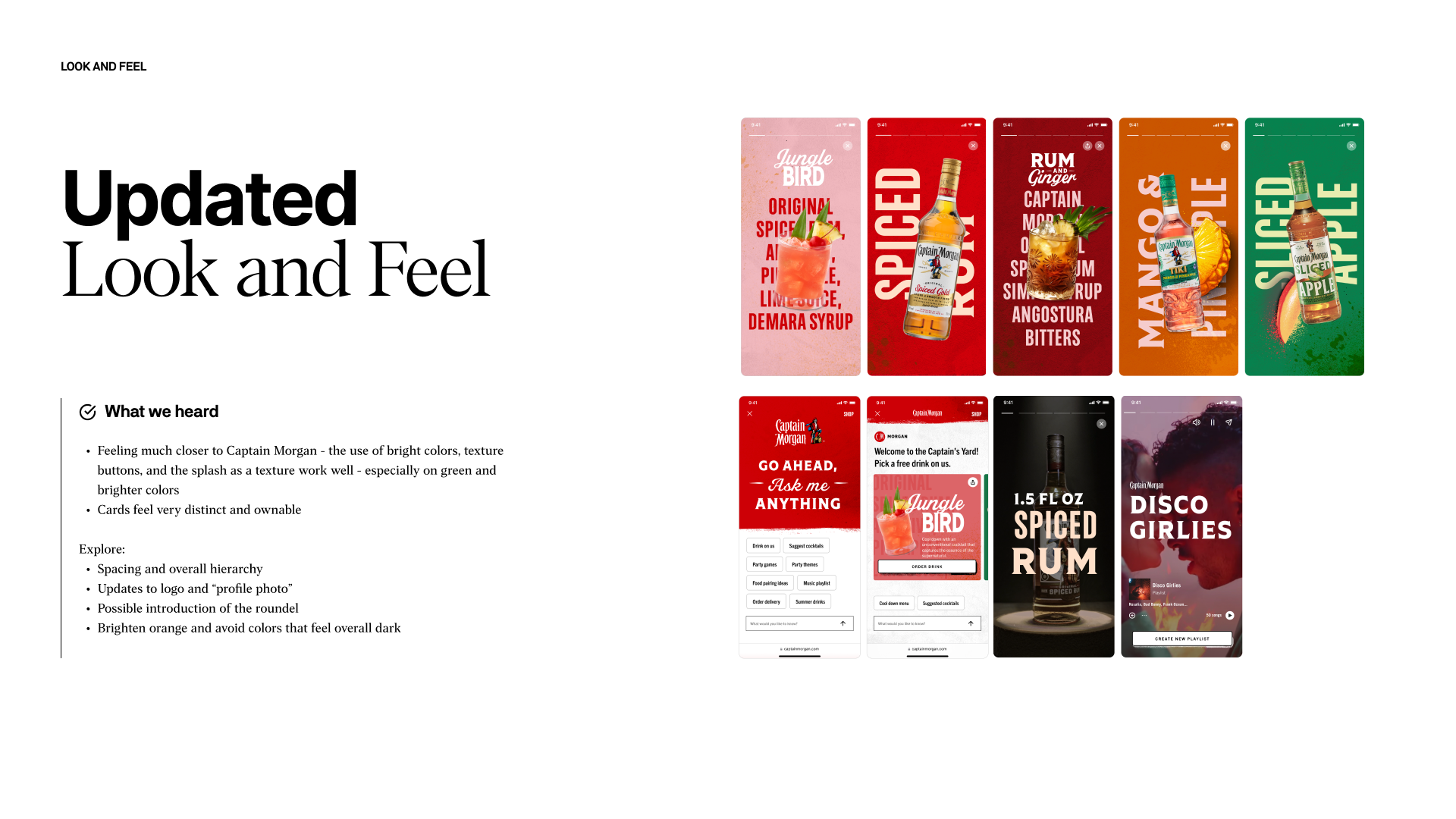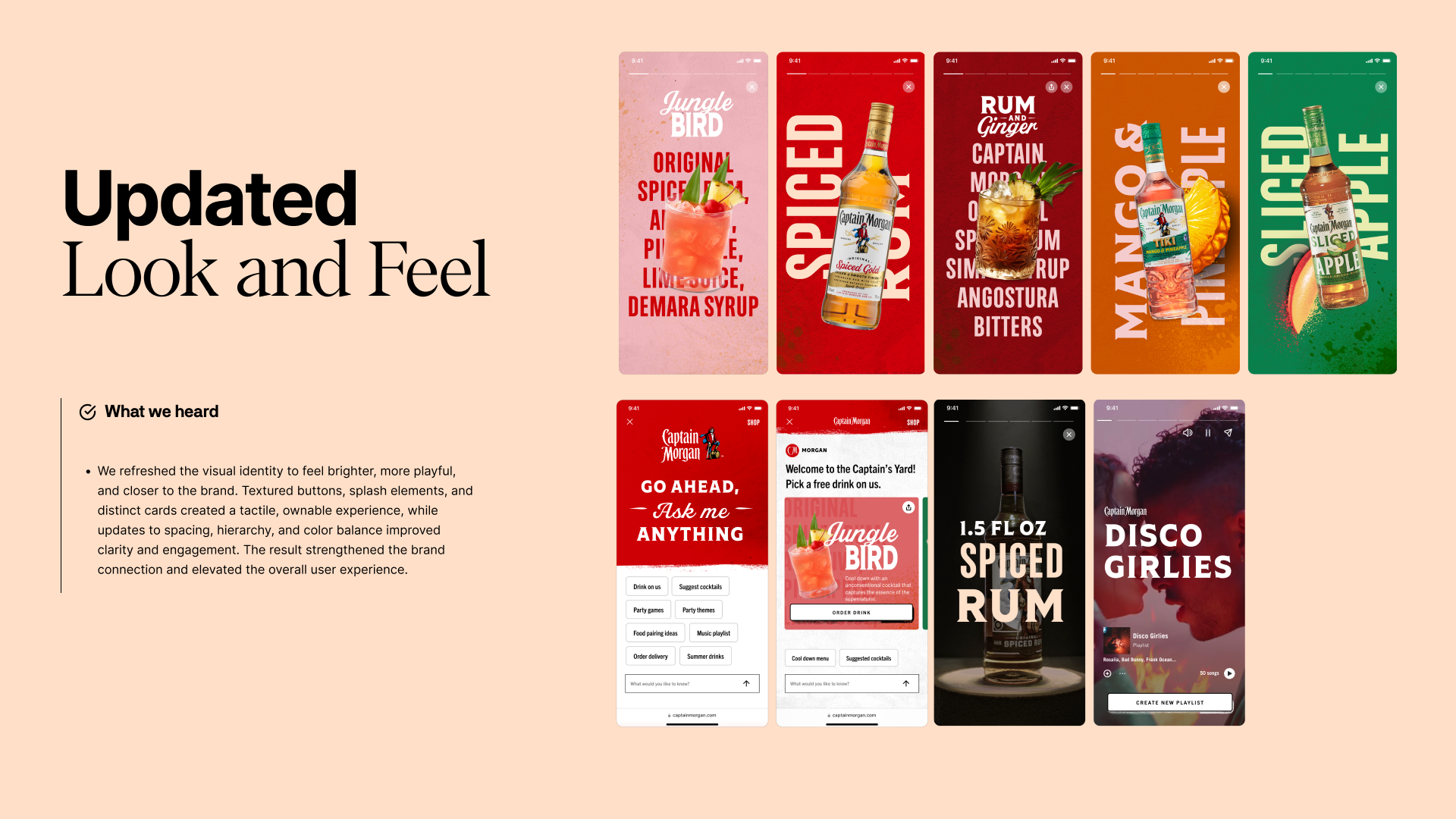 We completely reimagined Captain Morgan’s digital presence by updating the design system with vibrant colors, playful typography, and dynamic card-based layouts that make content feel interactive and immersive. AI-driven assistance ensures each experience feels tailored, giving fans moments of discovery and surprise at every touchpoint. By combining these design updates with audience insights, we identified distinct ways to bring the Captain’s mischievous, adventurous personality to life online, whether through storytelling, social engagement, or interactive product experiences creating a digital world that’s as bold, unapologetic, and “Ugly Delicious” as the brand itself.