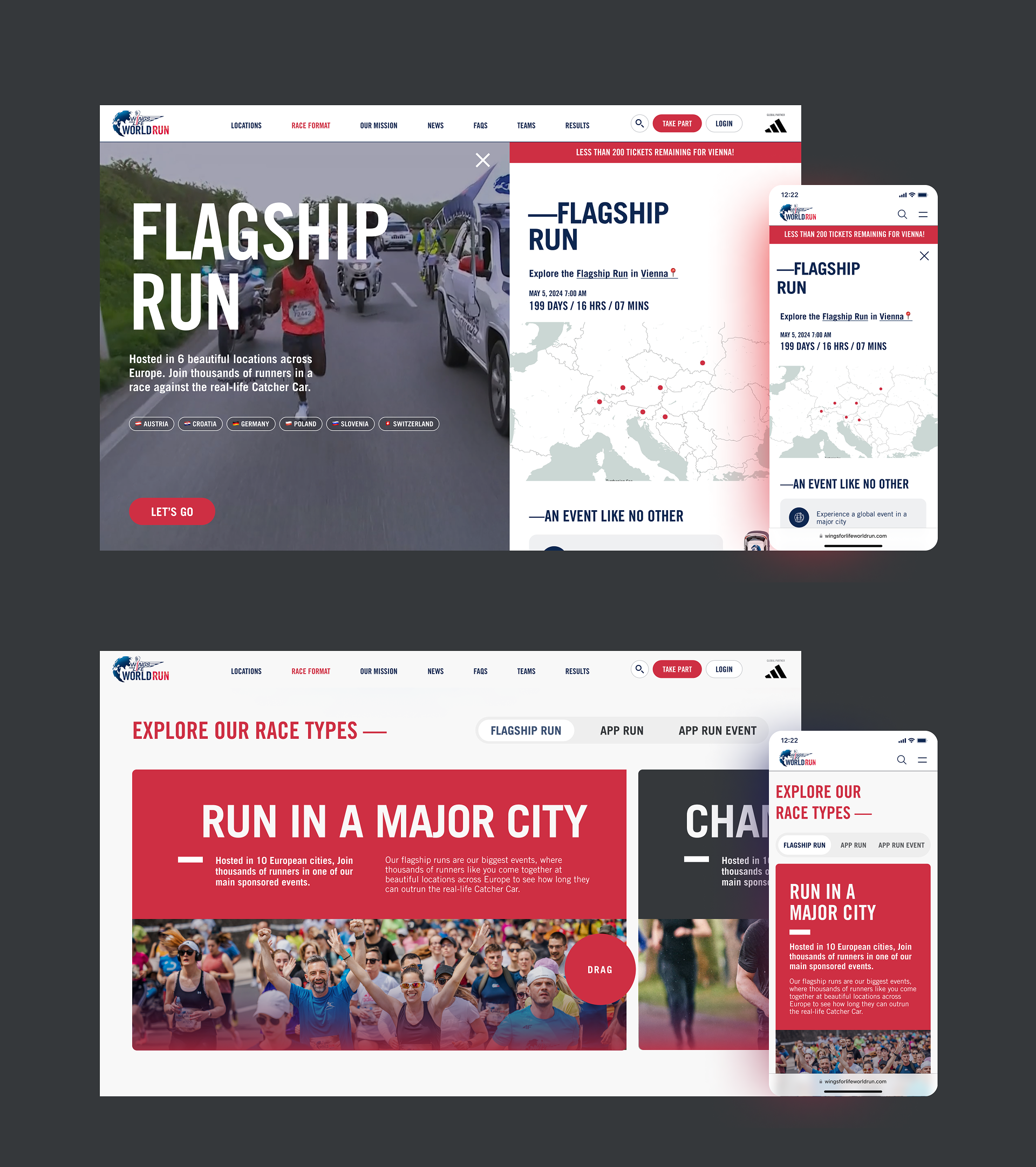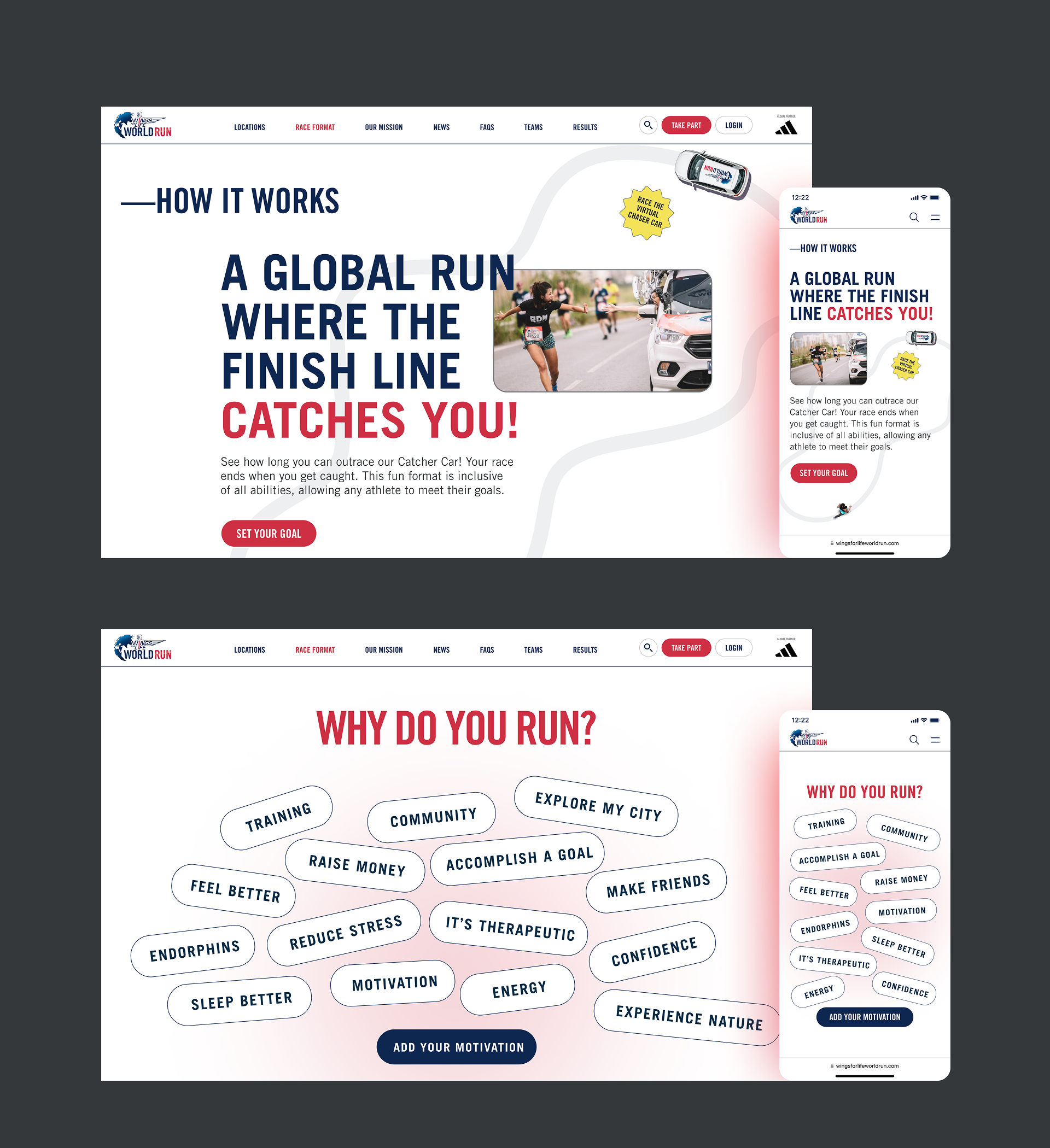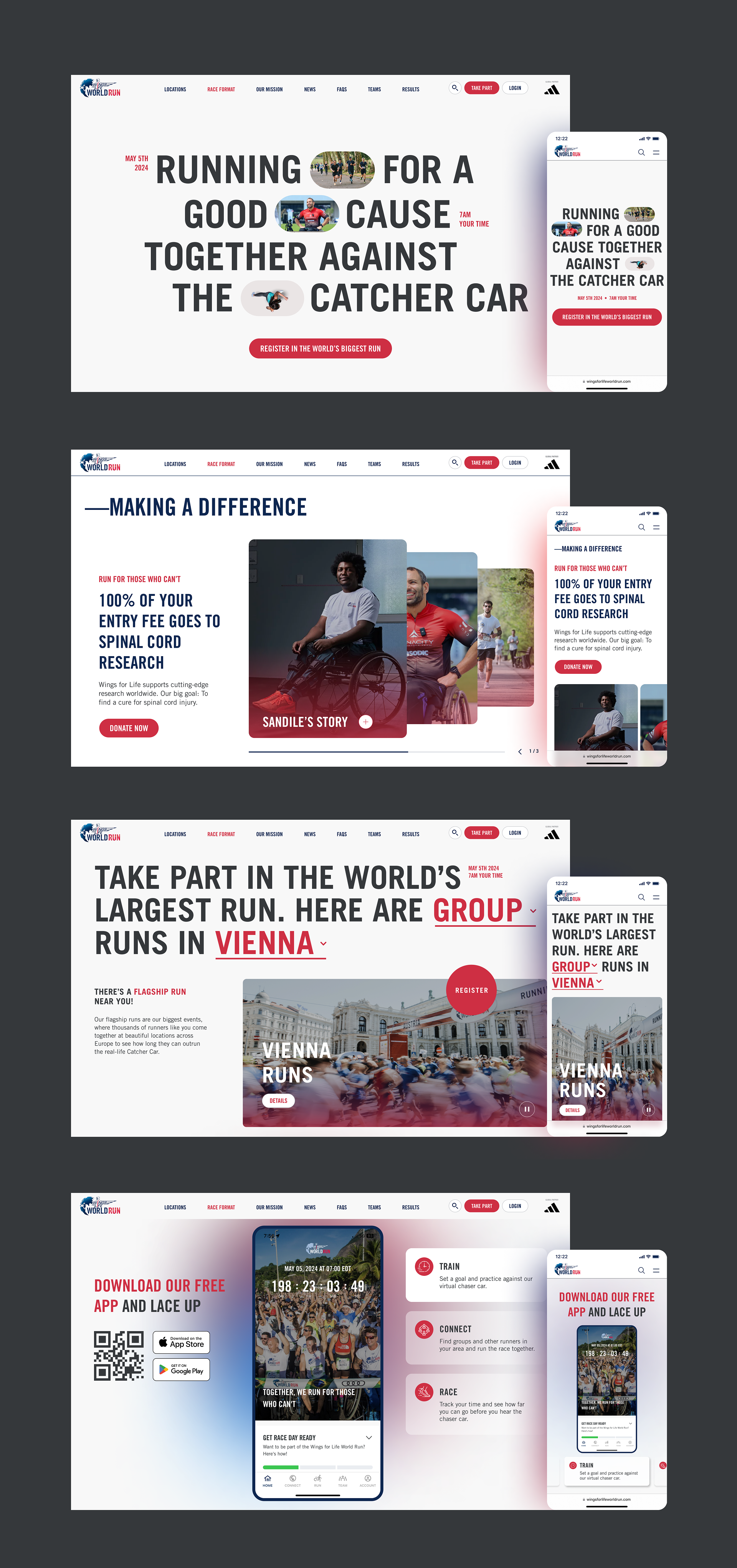 We created a dynamic, inclusive digital experience for the Wings for Life World Run, hosted across six cities worldwide. Participants can join in person or connect with virtual run groups, making it easy for anyone to take part regardless of location or ability. The site and free app let runners train against the virtual Catcher Car, track their progress, and engage with the global community, fostering connection while ensuring the race is accessible and fun for everyone.